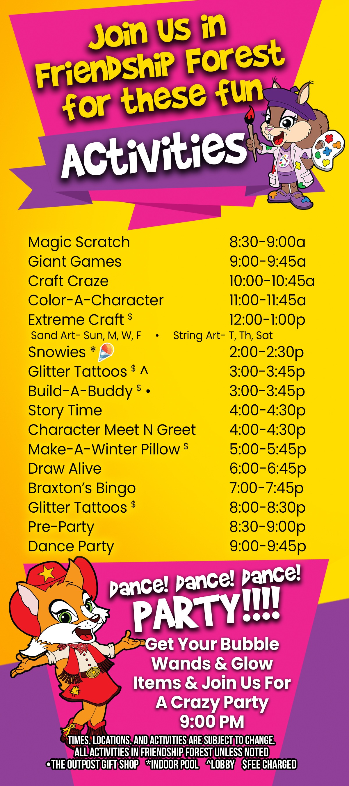 Join our Forest Friends for a jam-packed schedule of fun and laughter! Enjoy daily activities for all ages, including Story Time, Bingo, Snowies, Craft Creations, Games, and more. The highlight of every evening? Our epic Dance Party—where the whole family can join in for a night of music and twirls. With something exciting happening every day, you're in for an unforgettable time!